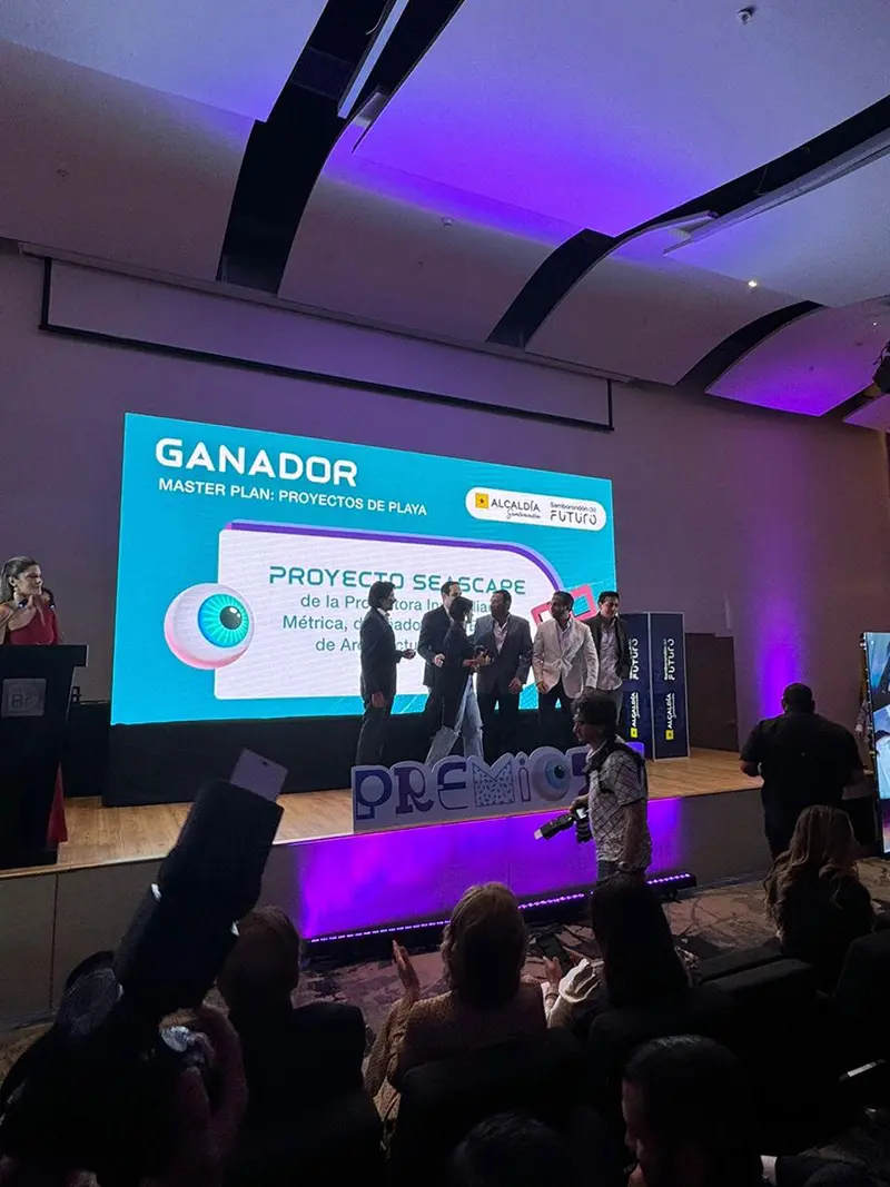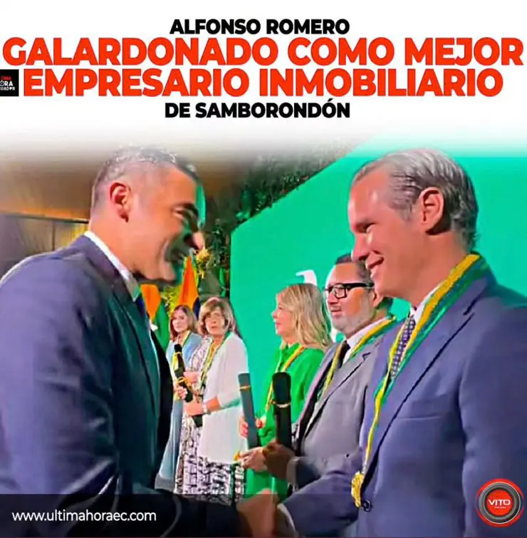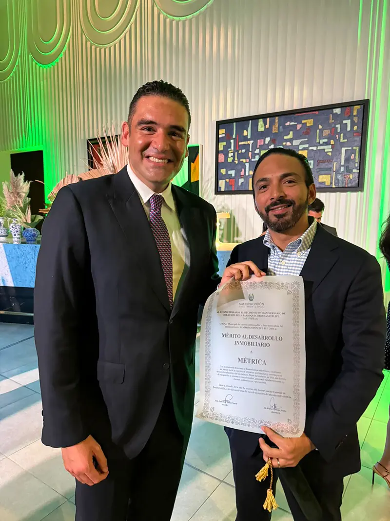 Presidente de la Camara de Comercio de Guayaquil Miguel Angel Gonzales le entrego el reconocimiento a la mejor inmobiliaria 2025 al Ing. Alejandro Jijón Gerente de Ventas de la Inmobiliaria Metrica del Pacifico.