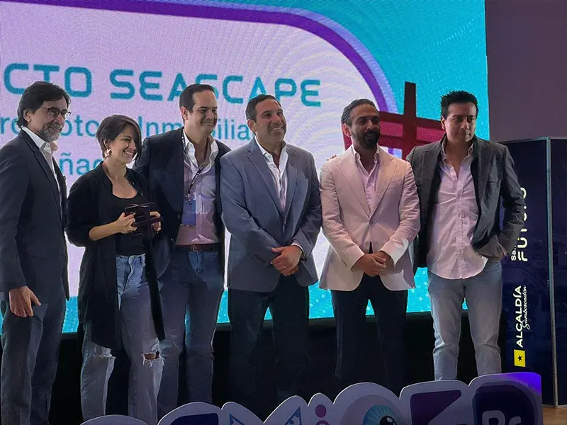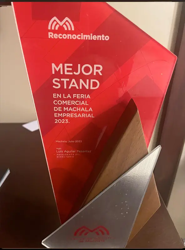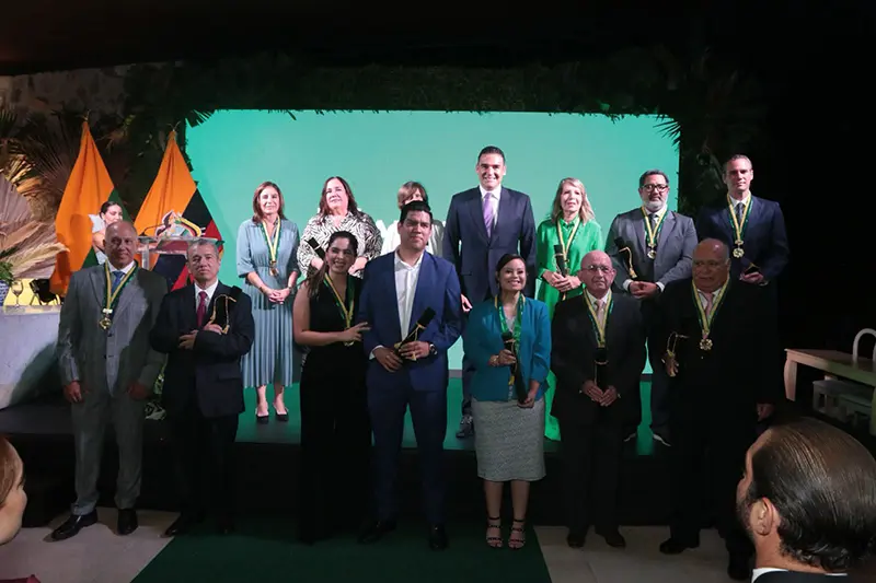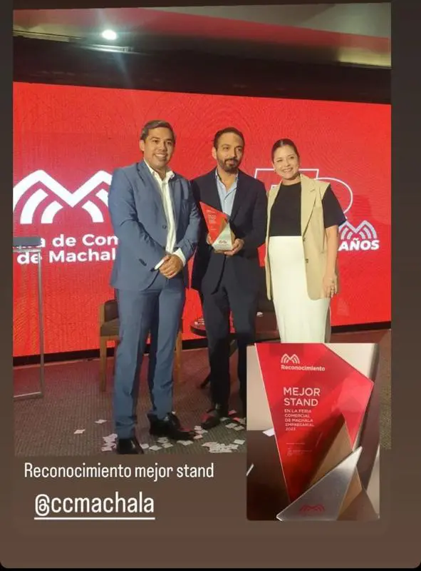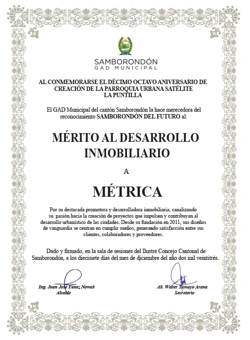 Presidente de la Camara de Comercio de Guayaquil Miguel Angel Gonzales le entrego el reconocimiento a la mejor inmobiliaria 2025 al Ing. Alejandro Jijón Gerente de Ventas de la Inmobiliaria Metrica del Pacifico.